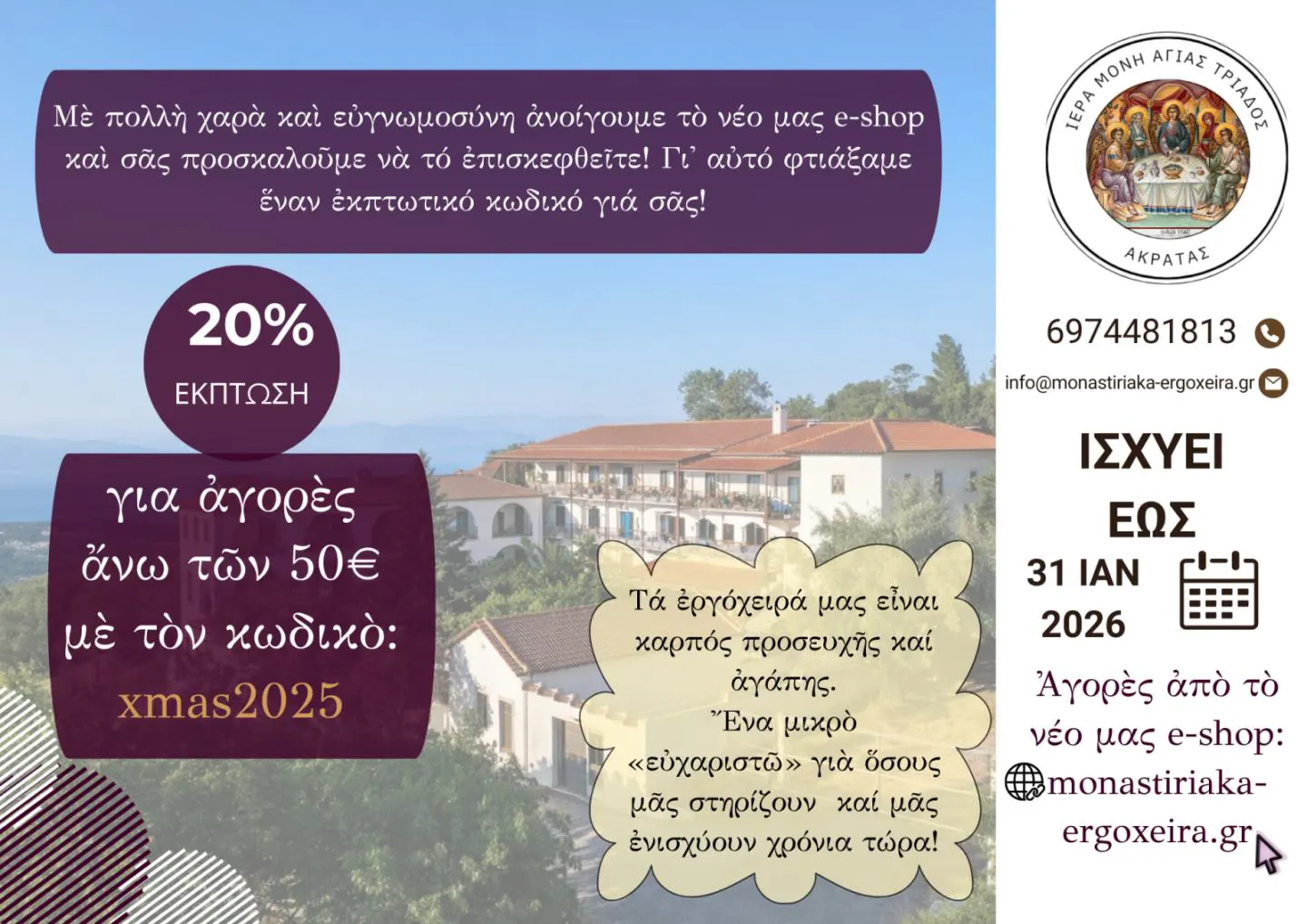 Ἀνοίγουμε ταπεινὰ τὸ Ἀρχονταρίκι μας καὶ διαδικτυακά, γιὰ ὅσους θέλουν νὰ πλησιάσουν τὴ μοναστηριακὴ ἁπλότητα καὶ νὰ πάρουν κάτι φτιαγμένο μὲ προσευχὴ καὶ ἀληθινή φροντίδα.
