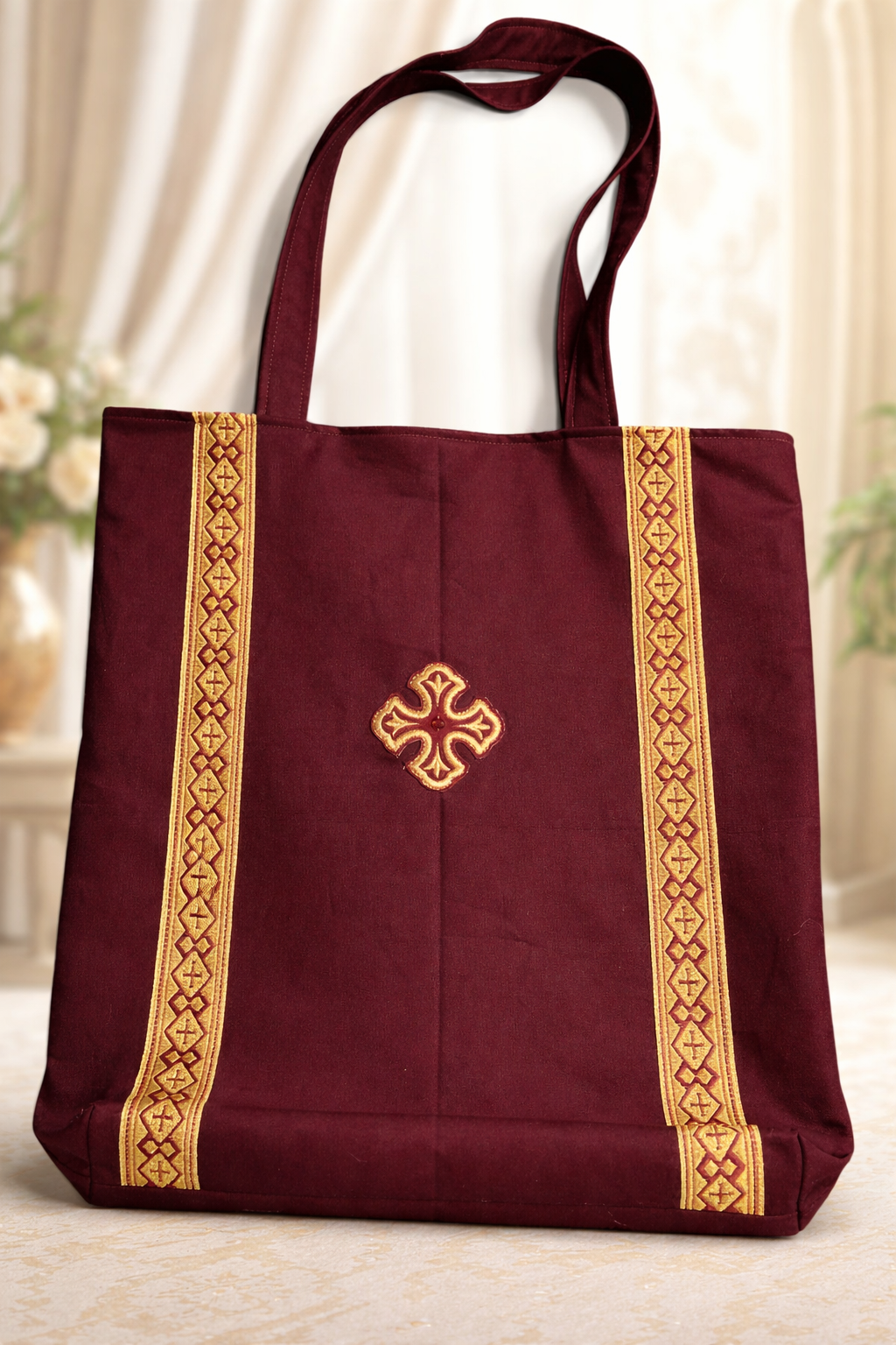 Ἡ χειροποίητη αὐτή τσάντα τοῦ Ἱεροραφείου μας ἀποτελεῖ συνδυασμὸ πρακτικότητας καὶ ἐκκλησιαστικῆς αἰσθητικῆς. Κατασκευασμένη μὲ διπλὸ, ἐνισχυμένο ὕφασμα καὶ πλήρως φοδραρισμένη, προσφέρει ἐξαιρετικὴ ἀντοχὴ καὶ σταθερότητα στὴν καθημερινὴ χρήση.