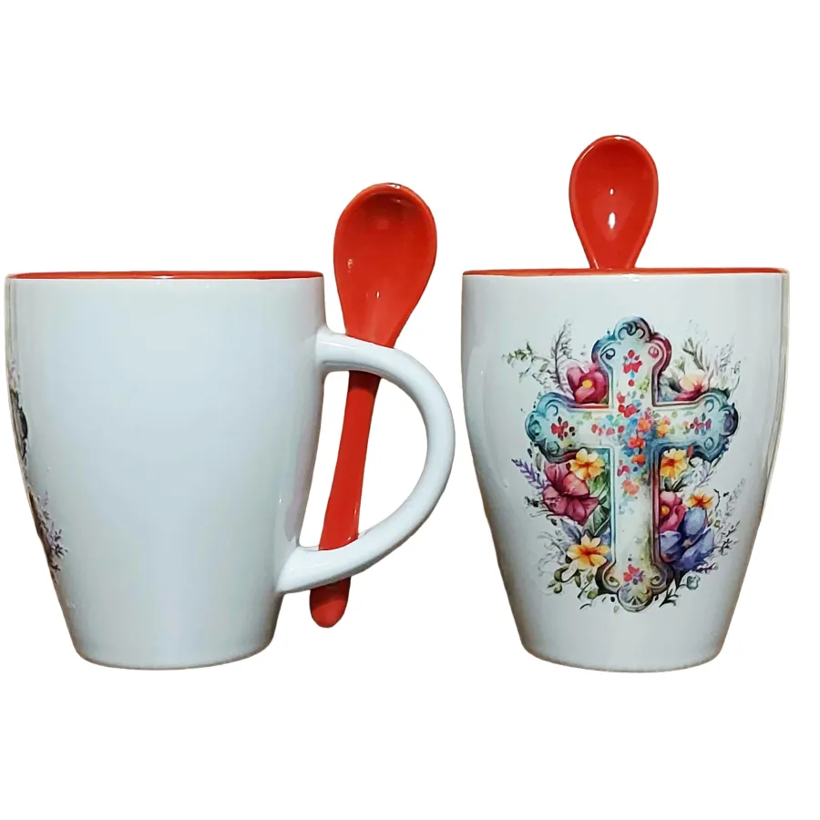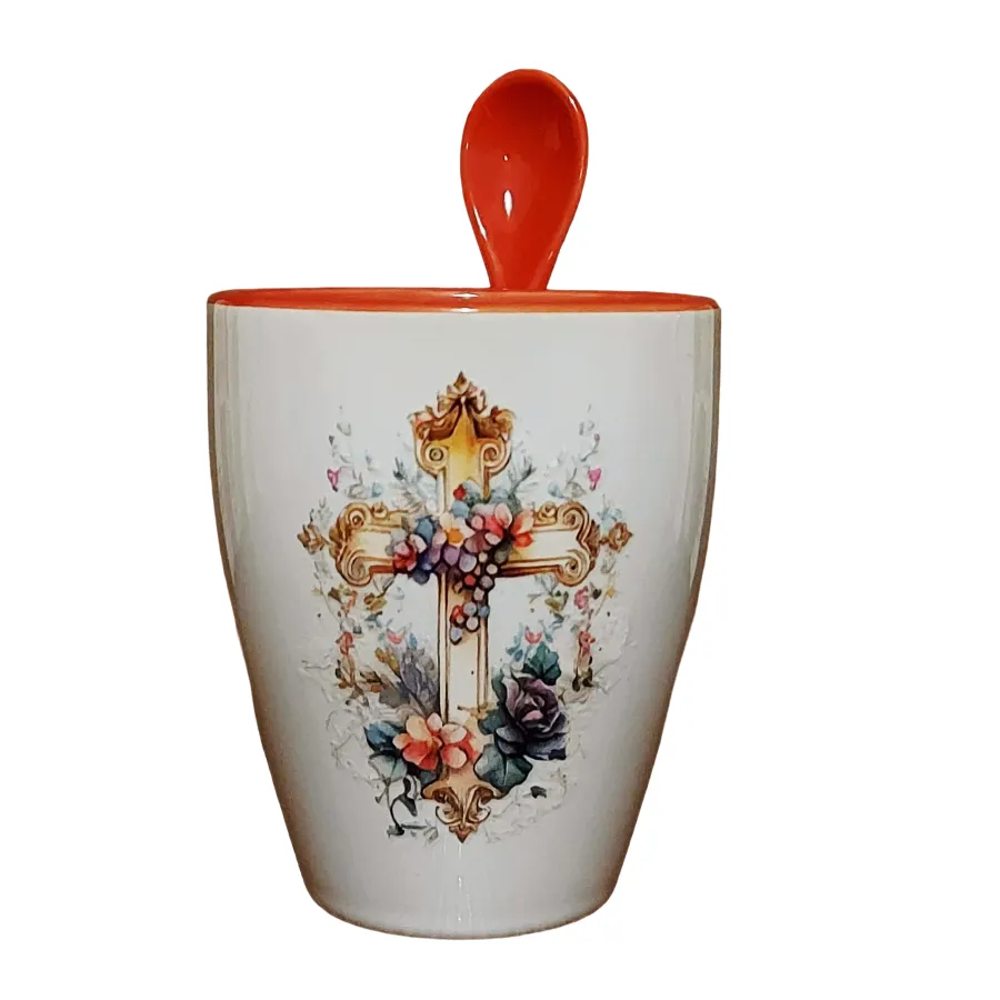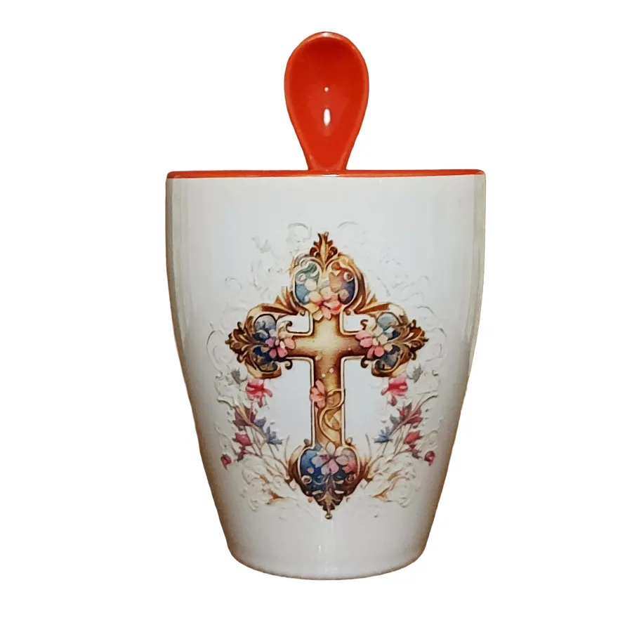 Κεραμικὸ φλυτζάνι μὲ Σταυρό καὶ κουταλάκι Κεραμικὸ φλυτζάνι, λευκῆς βάσεως, μὲ ἐσωτερικὸ χρῶμα καὶ ἀντίστοιχο κεραμικὸ κουταλάκι.