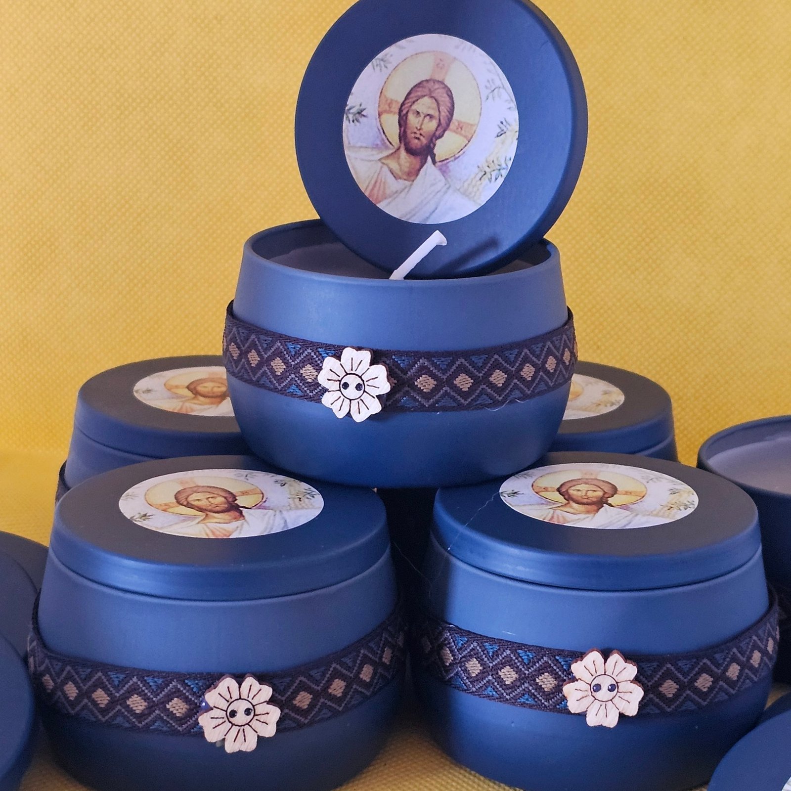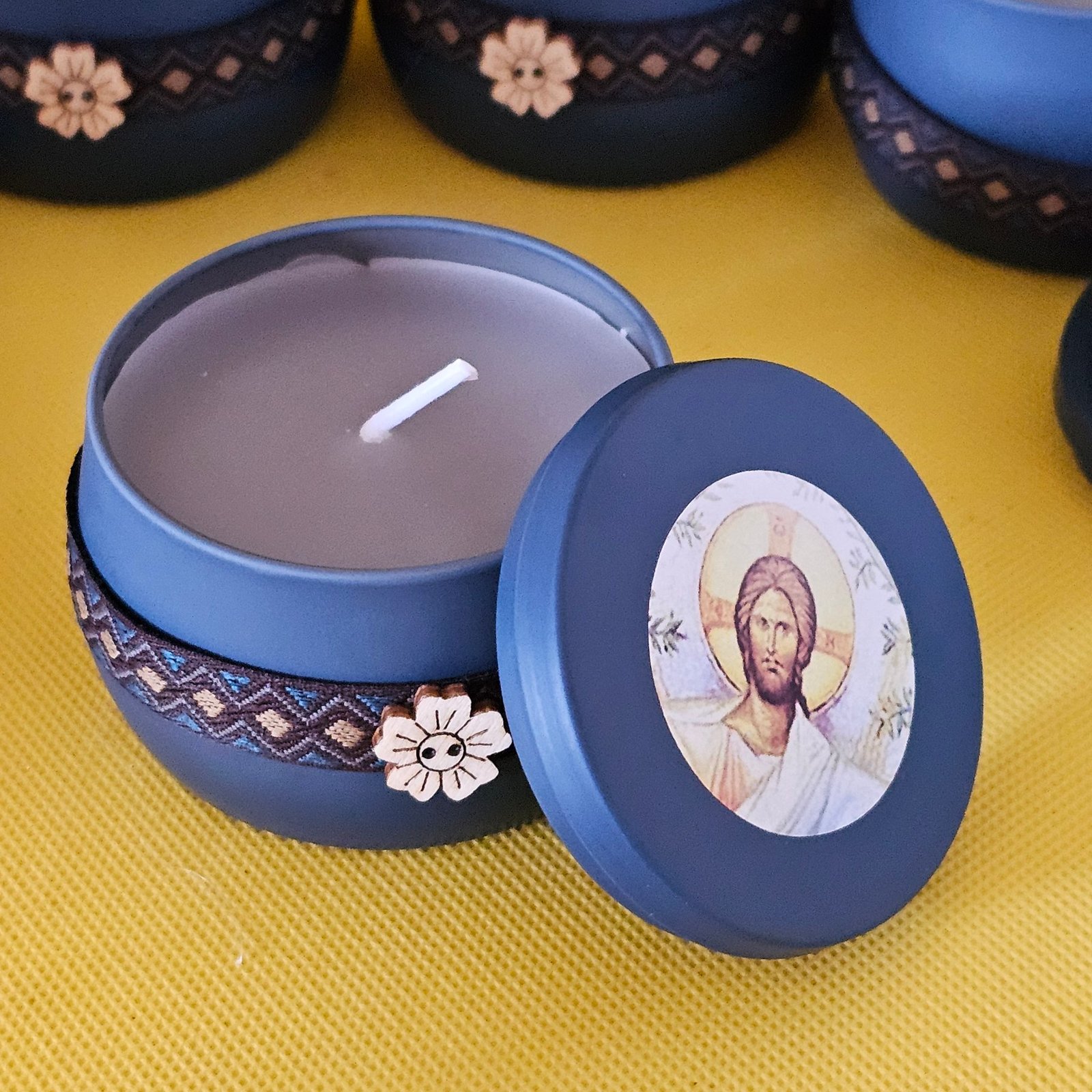 Το χειροποίητο κερί προσευχής σε μεταλλικό κουτάκι με εικόνα Χριστού είναι ένα μικρό φως ελπίδας. Ένα αντικείμενο απλό και σεμνό, που κουβαλά μέσα του προσευχή και κόπο χεριών, και προσφέρεται ως ευλογία.