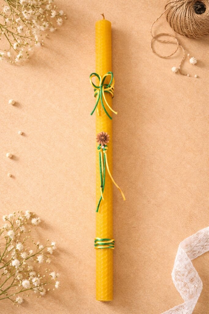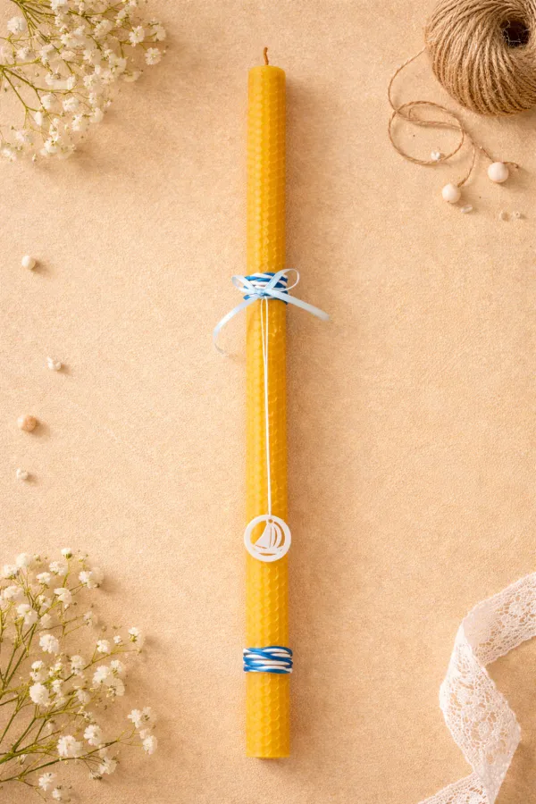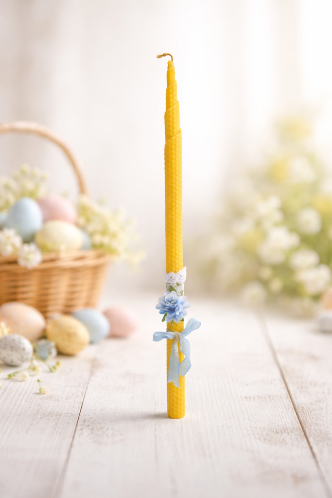 Λαμπάδα 70 εκ., από γνήσιο φυσικό κερί, ψηλή, λεπτή και επιβλητική, φτιαγμένη με σεβασμό προς την ιερότητα της Αναστάσεως.
