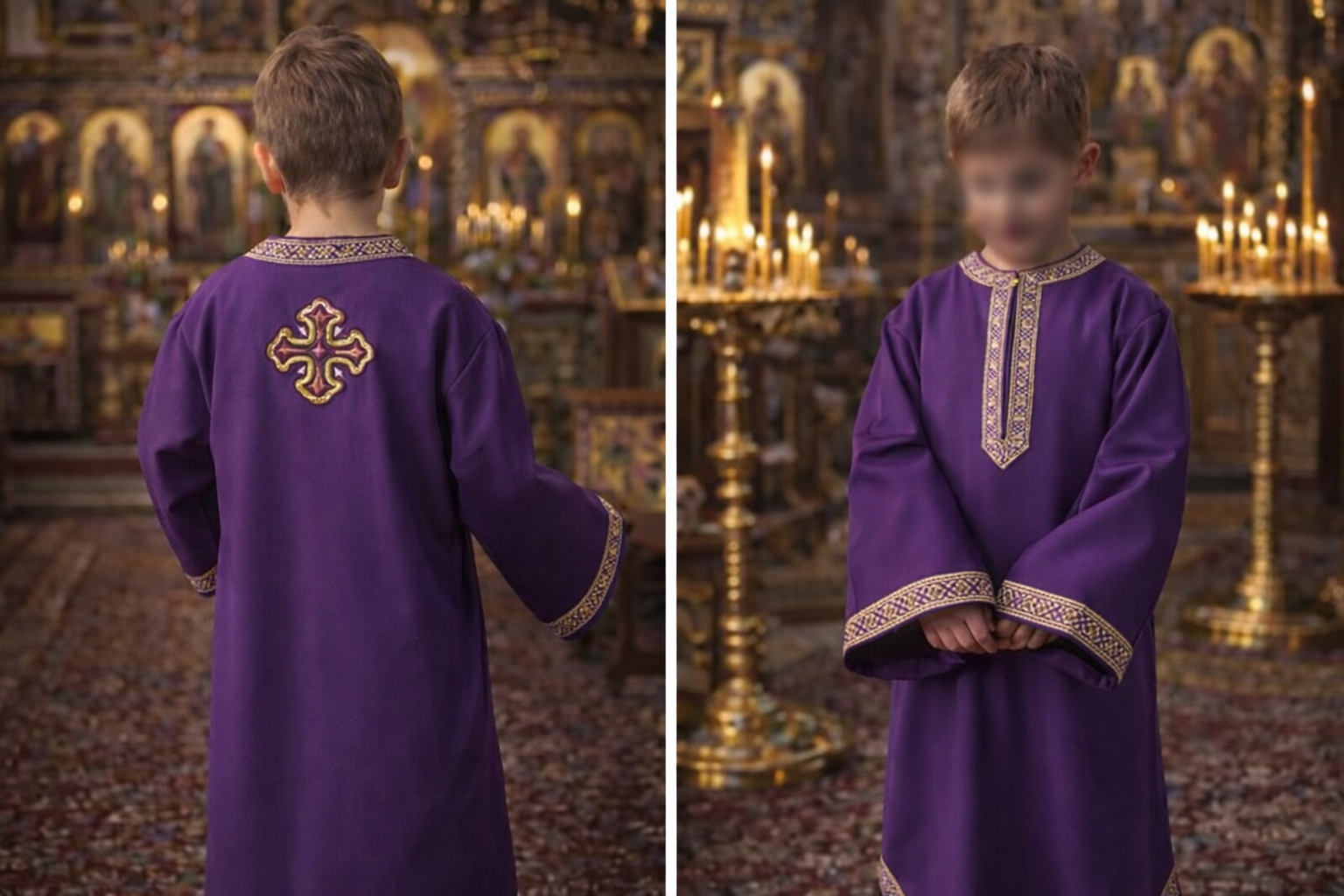 Ἡ παιδικὴ πένθιμη διακονικὴ στολὴ σὲ βαθὺ μώβ χρῶμα εἶναι ἕνα σεμνὸ καὶ καλαίσθητο ἱερατικὸ ἔνδυμα, σχεδιασμένο γιὰ μικροὺς διακόνους ποὺ διακονοῦν μὲ σεβασμὸ στὸ ἱερὸ θυσιαστήριο.