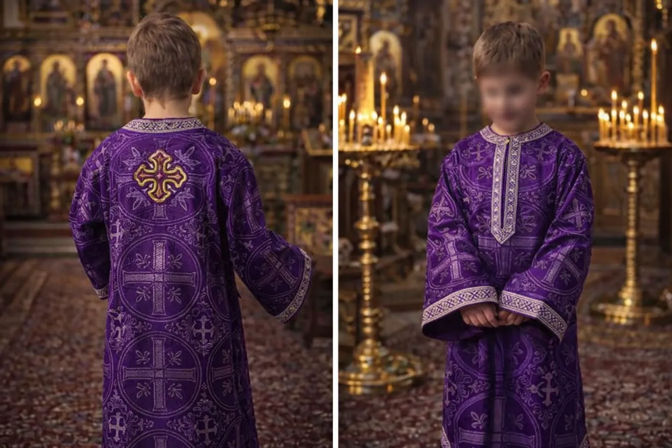 Η παιδική πένθιμη διακονική στολή σε βαθύ μωβ χρώμα είναι ένα σεμνό και καλαίσθητο ιερατικό ένδυμα, σχεδιασμένο για μικρούς διακόνους που διακονούν με σεβασμό στο ιερό θυσιαστήριο.
