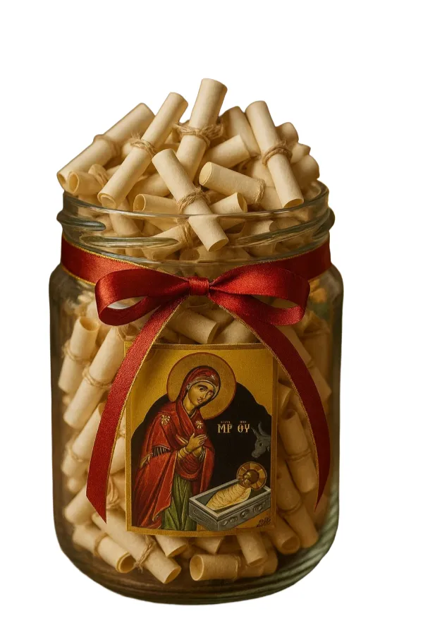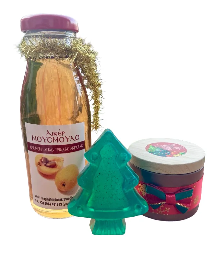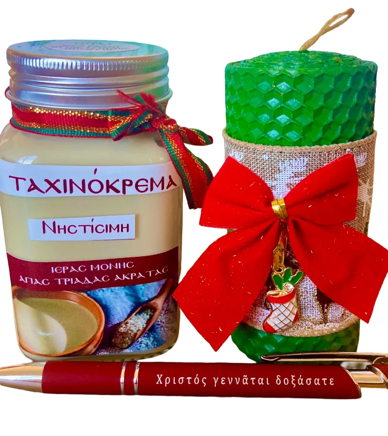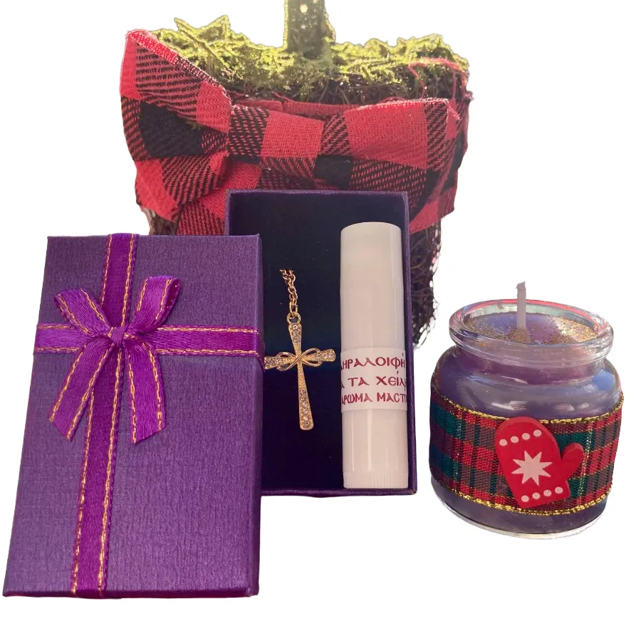 Σὲτ δώρου ποὺ περιλαμβάνει ἕνα σταυρό, ἀρωματικὸ κερὶ καὶ κεραλοιφὴ γιὰ τὰ χείλη μὲ ἄρωμα μαστίχα.