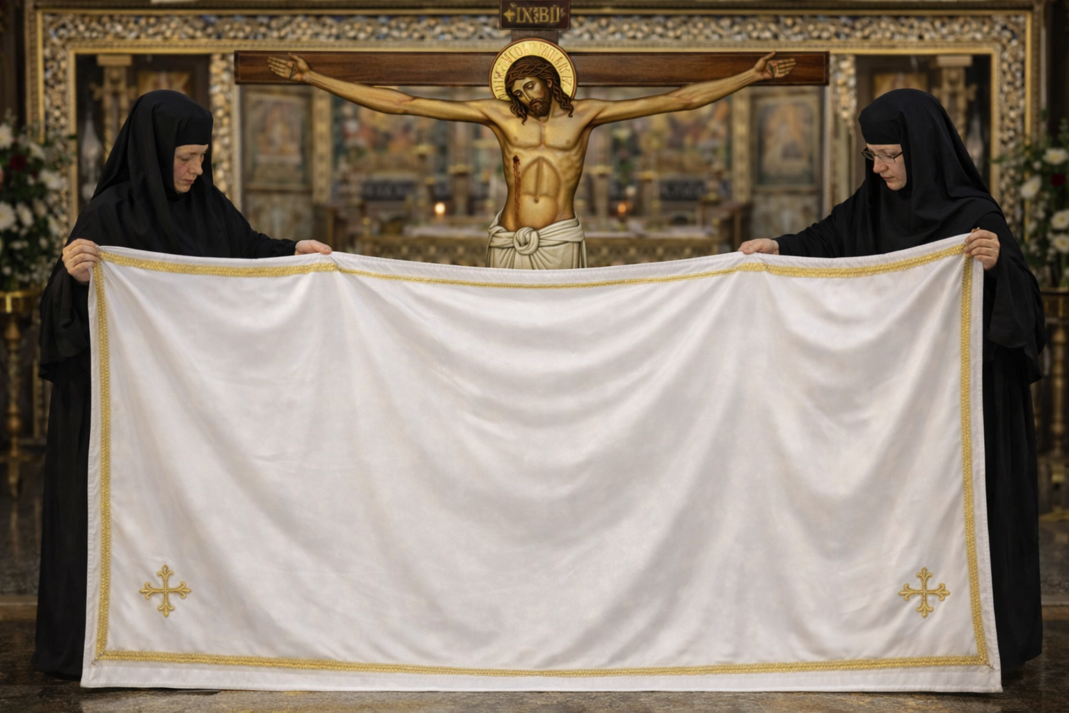στολισμένο μὲ χρυσὴ τρέσα καὶ τέσσερεις χρυσούς σταυρούς στίς τέσσερεις ἄκρες γιὰ νὰ ἐξυπηρετεῖ μὲ τήν πρέπουσα εὐπρέπεια τὴν ἱερὰ ἀκολουθία τῆς Ἀποκαθηλώσεως.