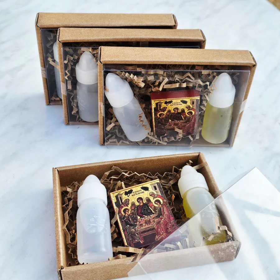 Ἕνα καλαίσθητο καὶ προσεγμένο πακέτο γιὰ καθημερινὴ χρήση καὶ προσευχή, ποὺ περιλαμβάνει ἁγιασμό, λαδάκι καὶ μιὰ εἰκόνα τῆς Ἁγίας Τριάδος. Ἰδανικὸ γιὰ ἐγκαίνια σπιτιοῦ, βαπτίσεις ἢ γιὰ προσωπικὴ χρήση, ἀποτελεῖ μιὰ ὄμορφη ἐπιλογὴ μὲ πνευματικὸ χαρακτῆρα. Ἕνα διαχρονικὸ πακέτο ποὺ προσφέρει εὐλογία, γαλήνη καὶ φροντίδα σὲ κάθε στιγμή.