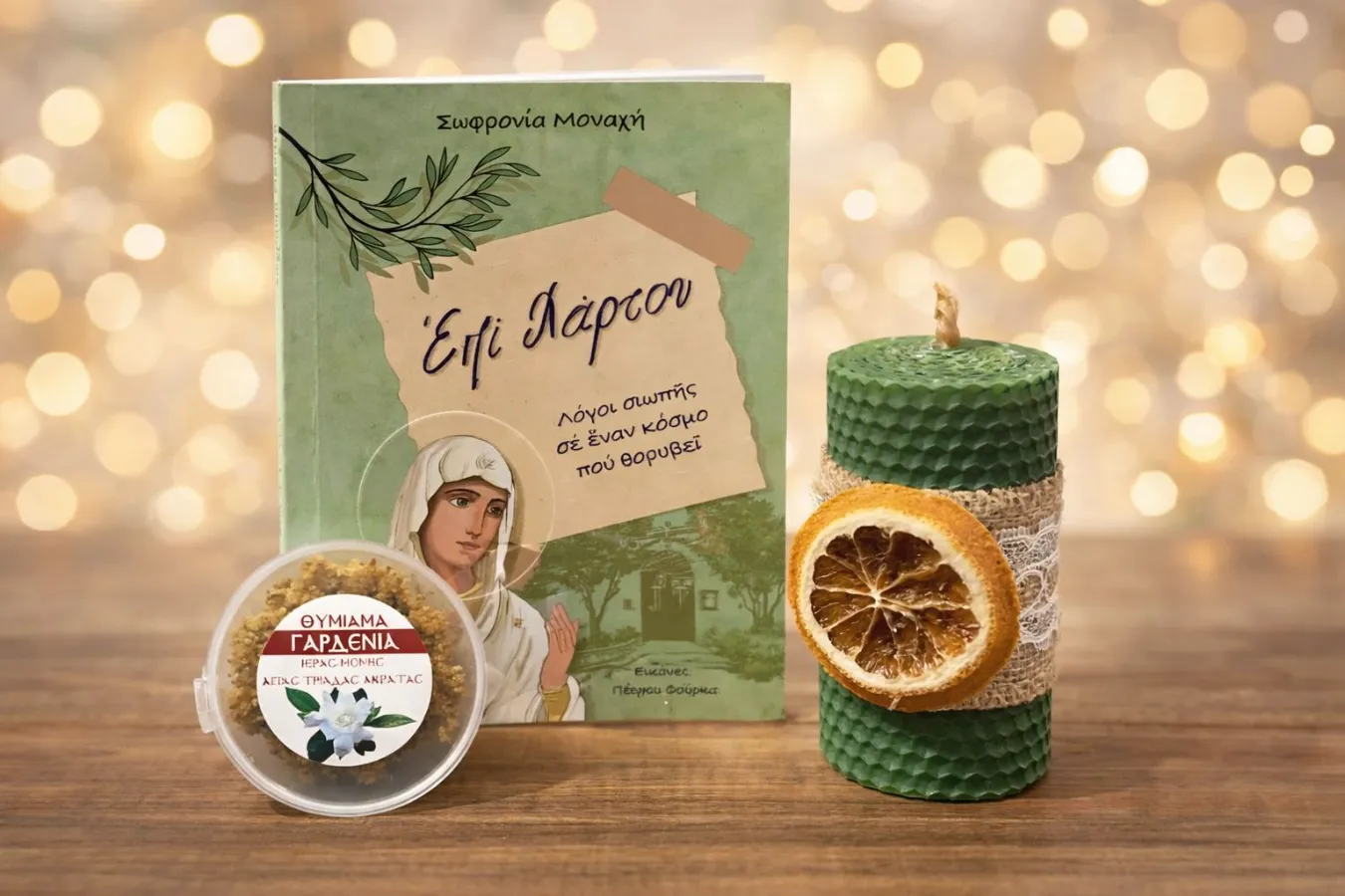 Το σετ περιλαμβάνει το βιβλίο Επί Χάρτου, ένα πράσινο κερί από γνήσια κηρήθρα, διακοσμημένο με λινάτσα, λευκή δαντέλα και μια αποξηραμένη φέτα πορτοκαλιού, και θυμίαμα πάστας με άρωμα γαρδένιας 20γρ. σε πλαστικό βαζάκι.